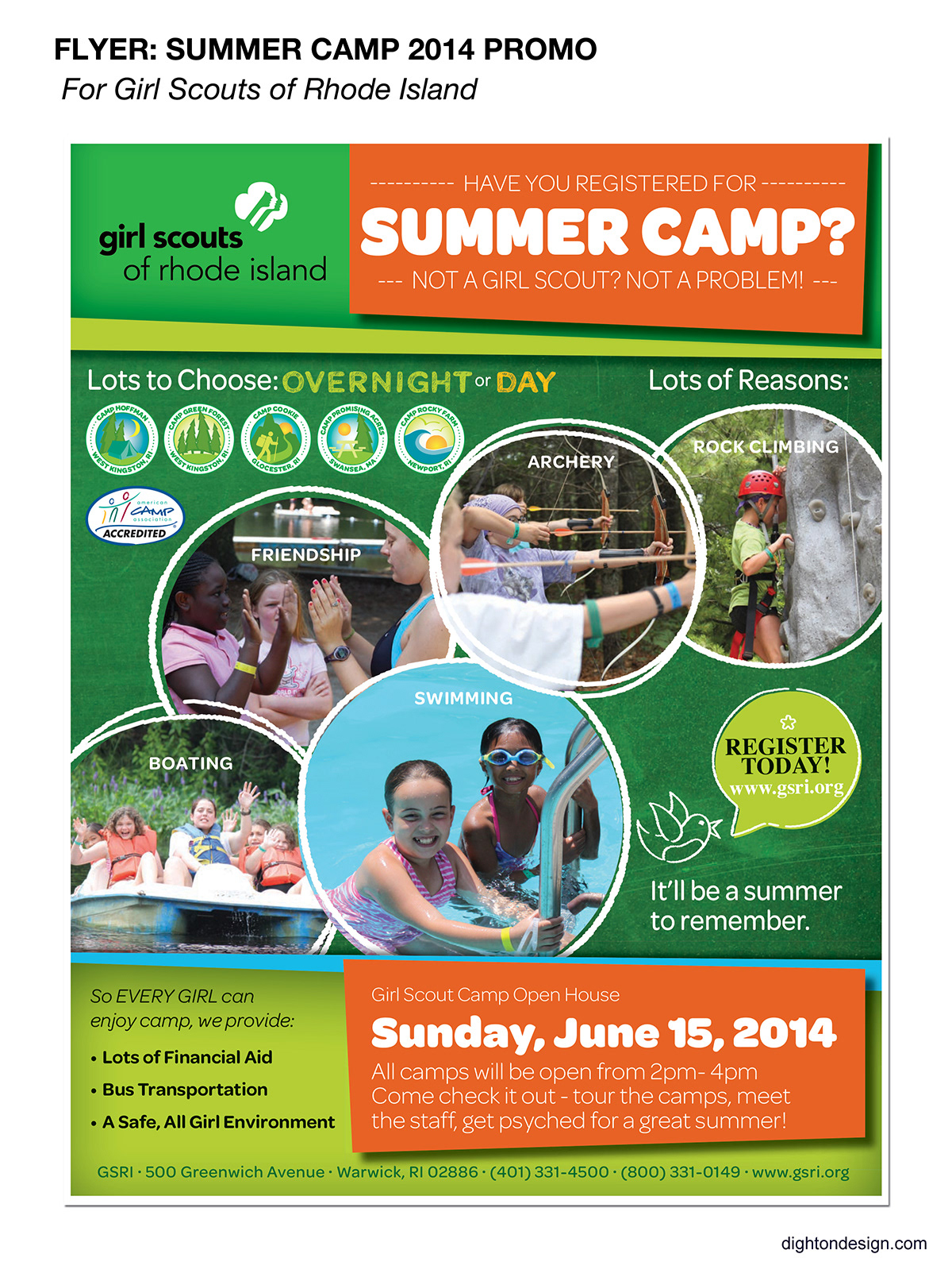 Girl Scouts of Rhode Island needed a promotional flyer to remind their Girl Scouts that the summer camp season was approaching. The flyer was to "show the girls how much fun summer camp is".